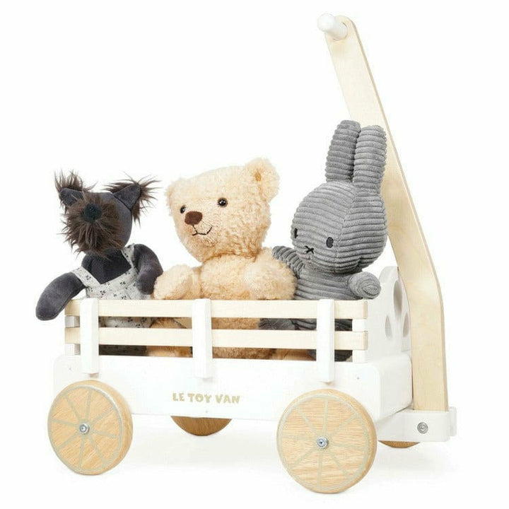 The sweetest pull along wooden cart, made for little explorers. This timeless toy with it's appealing traditional design is full of nostalgic charm and waiting for adventures. Store little treasures and take soft toy friends on a ride with this beautifully crafted wagon. Engineered from sustainably sourced rubberwood w
