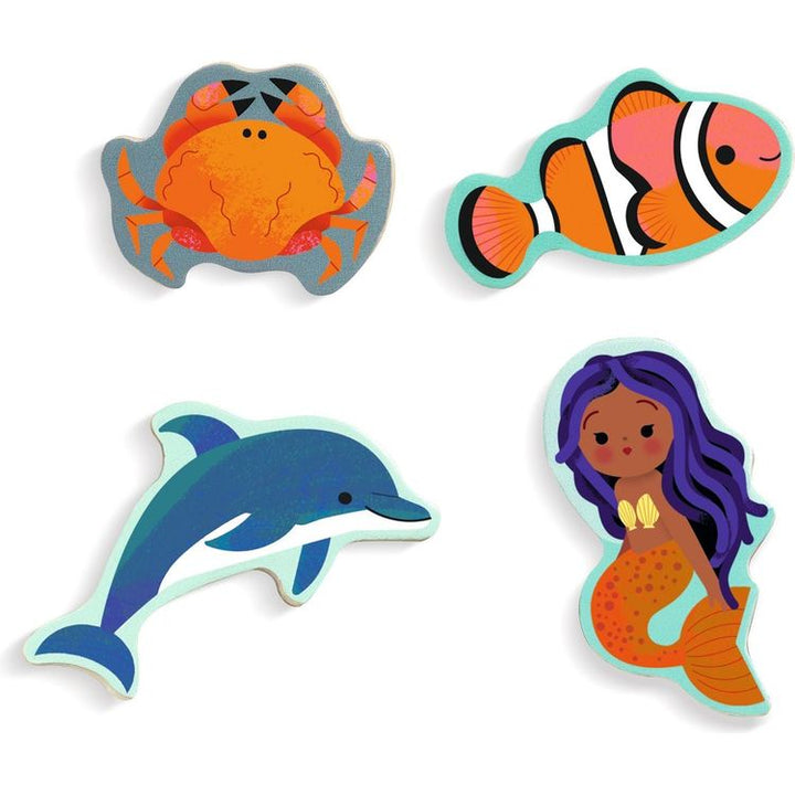 An enchanted ocean world-themed wooden puzzle with mermaids. Put the 22 pieces in their places by recognizing the shapes on the board. Colors and outlines drawn beneath the pieces help children identify the correct piece. Chunky pieces that are easy to grasp. Comes in a box: practical as a gift and for storage. Content