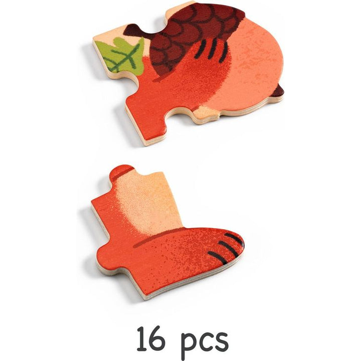 Inside the animal-shaped wooden frame, recreate the picture to discover a lovely little squirrel. The Djeco jigsaw puzzle consists of 16 bricks, in different shapes and in a good size. The Jigsaw puzzle helps to strengthen the fine motor skills and logical sense of the little ones, and it can be put together again and